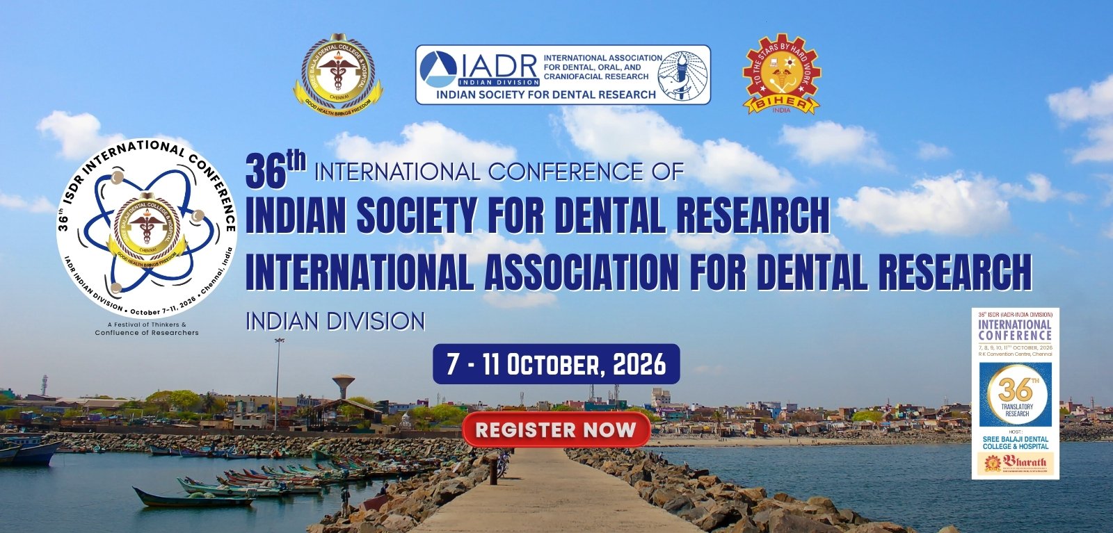 The International Dental Research Conference is a premier global event bringing together dentists, dental researchers, clinicians, academicians, and students to explore the future of oral health. Hosted by Sree Balaji Dental College and Hospital in collaboration with the Indian Society for Dental Research (ISDR) and the International Association for Dental Research – Indian Division (IADR), this prestigious four-day event will take place from October 8–11, 2026.